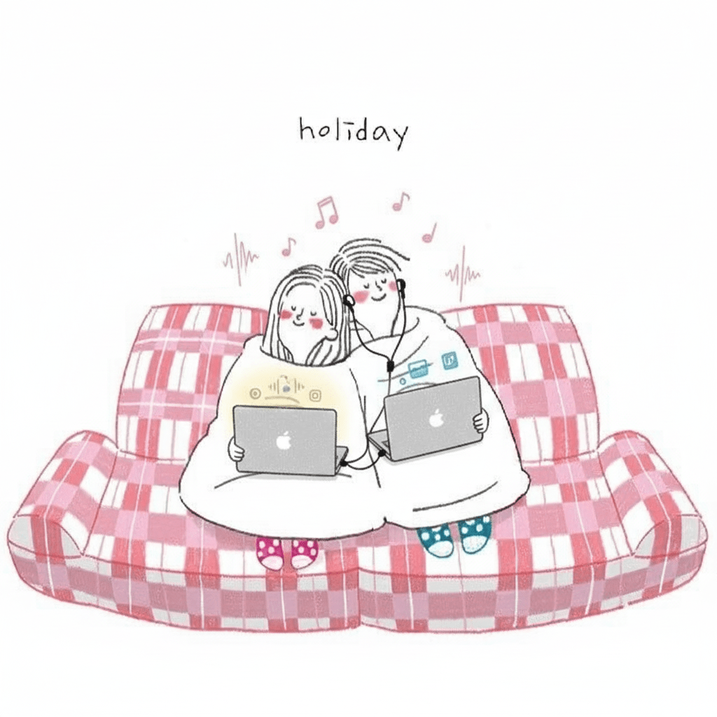 El sofá se convirtió en nuestro refugio. Allí compartimos el silencio y el paso del tiempo, ese que no pesa cuando se vive acompañado. A ratos, nuestras manos se buscan, se encuentran y vuelven a soltarse, como si supieran exactamente cuándo hacerlo. La música suena suave, alimentando la creatividad, hasta que en algún momento nos cansa y cambiamos de sintonía. Tú te quedas viendo una serie; yo me pongo los auriculares, escucho canciones en inglés y escribo. Aun así, seguimos conectados. Y entonces suena el timbre. Nos miramos con ilusión: ha llegado ese paquete que llevábamos días esperando.